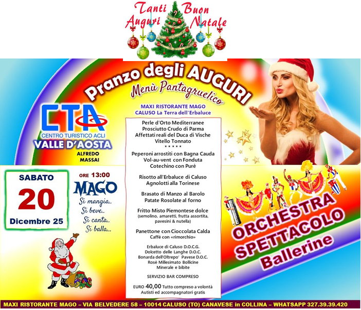 Proposta riservata esclusivamente ai soci del Cta-Vda Pranzo Sociale di fine anno 2025 Sabato 20 Dicembre 2025 Un evento enogastronomico per trascorrere tutti insieme una giornata dedicata alla chiusura dell'anno sociale, allo scambio degli auguri natalizi, in attesa della festa di Capodanno. | |||